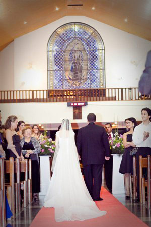 Quando chegou a hora, o frio na barriga aumentou e estava quase chorando de emoção, mas pensei, vai borrar toda a maquiagem, que boba, hihihih. Vi os arranjos que minha mãe fez para a igreja e fiquei muito feliz pelo resultado do trabalho dela, simples e delicado. Vi o Jônatas todo elegante e mais lindo do que nunca e pensei: esse é o homem com quem ficarei para o resto da minha vida. A vontade de chorar de emoção foi muito grande, fiz um esforço danado para não chorar, e nessa minha tentativa minha mão que segurava o buque tremia muito. Fiquei muito feliz em ver nossos amigos presentes e compartilhando esse momento tão especial.