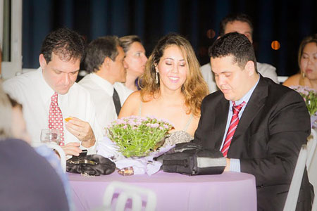 Como havia dito a vocês, escolhemos um salão de festa perto da igreja, em menos de 10 minutos chegamos ao clube. Porém, demoramos um pouco para entrar devido à fila, mas o meu cerimonial conseguiu um jeito de passarmos a frente de todos por outra entrada, ehhhhh. Mesmo assim, tivemos que ficar um tempo dentro do carro esperando nossos convidados terminar de passar, pois ainda iríamos tirar algumas fotos como casados. Quando chegamos ao salão, o cerimonial anunciou a nossa entrada e o DJ tocou “Star Wars“, “nerd nem um pouco”, sei que na hora teve twittadas referentes à nossa entrada ao salão, né, Mafalda? Fizemos os nossos agradecimentos aos amigos e parentes pela presença de todos e logo fomos para o brinde. Tiramos fotos com os padrinhos, pais e irmãos, e depois saí para trocar de roupa. Amei os fotógrafos, me faziam rir o tempo todo.