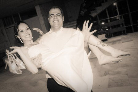 Eu e o Jônatas não apresentamos a tradicional valsa de casamento e sim uma salsa. Contei a vocês que o Jônatas é professor de forró e salsa? Pois é, e escolhemos a salsa para apresentar aos nossos convidados, sendo que depois teria somente o bom forró pé de serra. Todos ficaram de queixo caído, porque não imaginavam que dançaríamos assim,